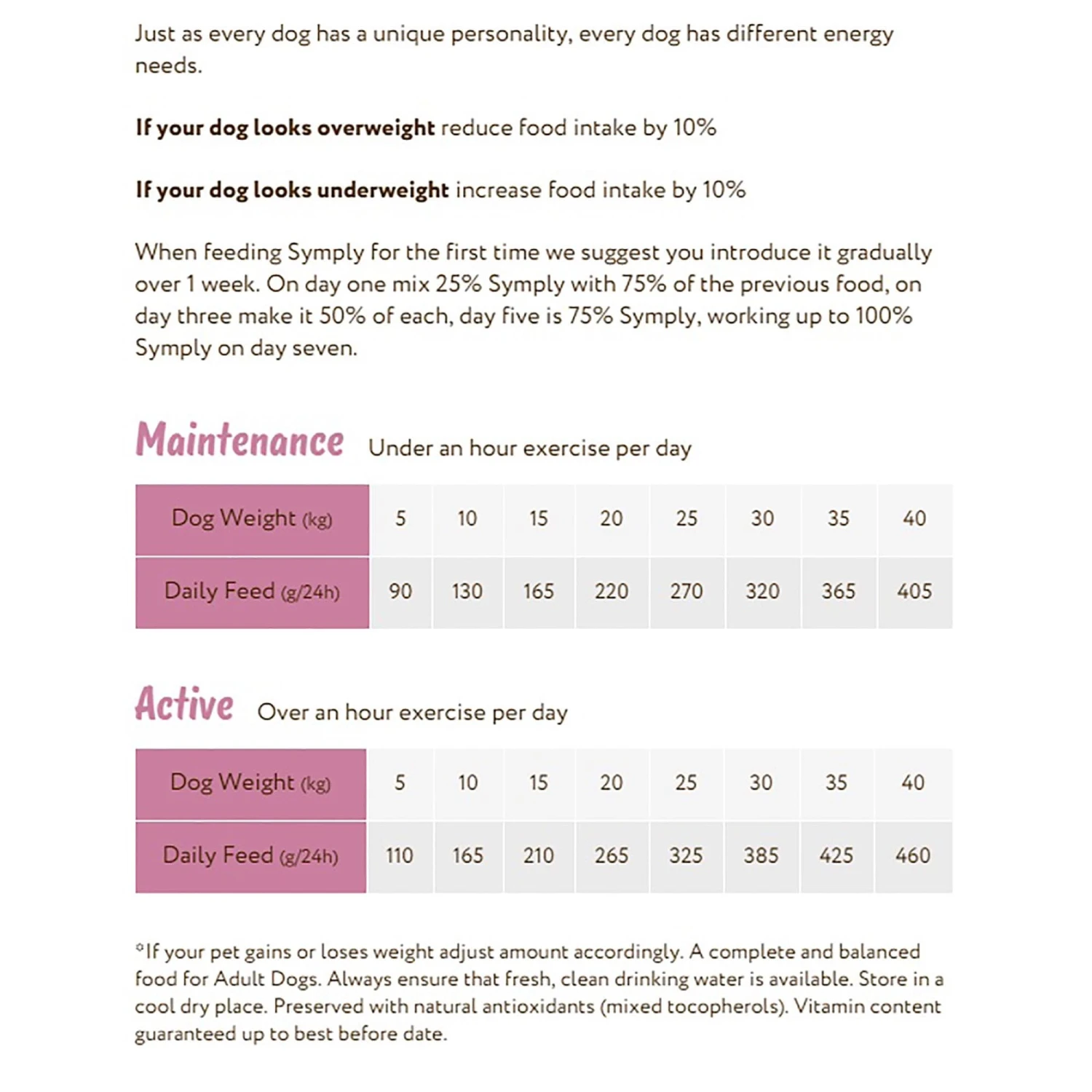 Symply have created an adult dog food that is nutritionally balanced, wholesome, natural, pure and simple. It’s rich in freshly prepared turkey, so it’s easy to digest, giving your dog the energy it needs. It also as added vitamin E and selenium to help maintain a healthy immune system for your dog.Â