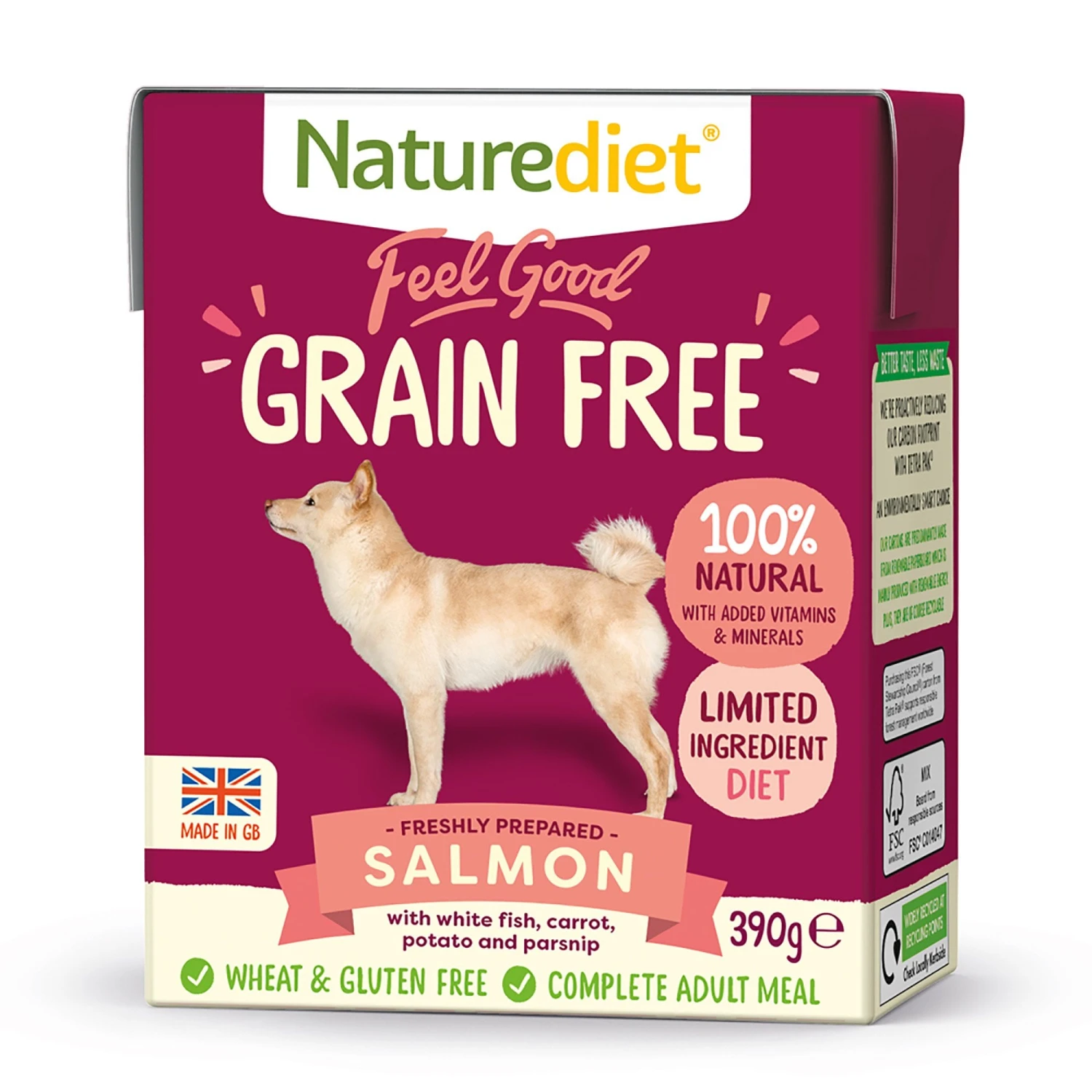 Free from preservatives, additives and artificial ingredients, Naturediet Feel Good Grain Free Salmon is freshly prepared and steam cooked using fish & vegetables from premium grade, ethical British suppliers.
