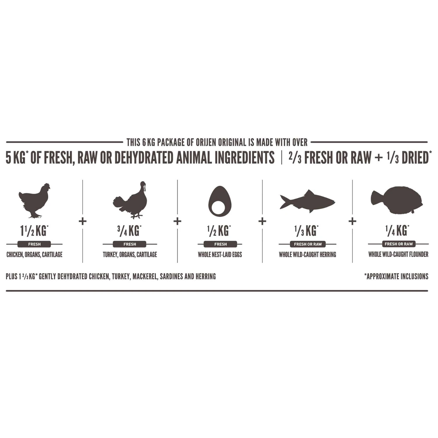 All Dogs possess the biological need for a diet that is rich and varied in meats and rich in protein. Orijen Original with unmatched inclusions of free-run chicken and turkey, wild-caught fish and nest-laid eggs delivered Fresh or Raw, in richly nourishing Whole Prey ratios that nourish your dog naturally and completely.