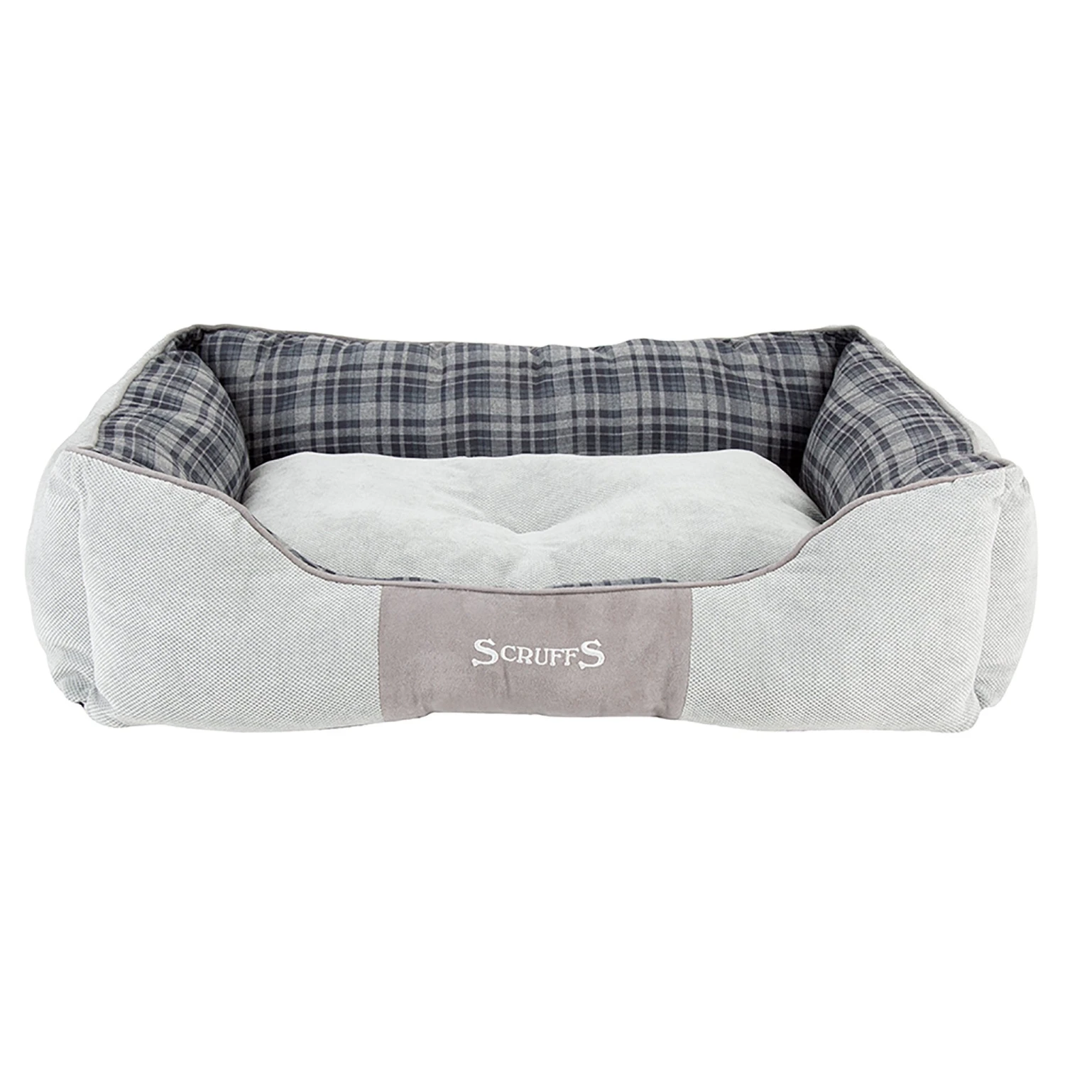 The Scruffs Highland dog bed collection has been produced predominantly using a rich chenille fabric. The vibrant grey colours are complemented with a distinctive grey tartan print, combined with faux suede piping and centre patch with an embroidered Scruffs logo.