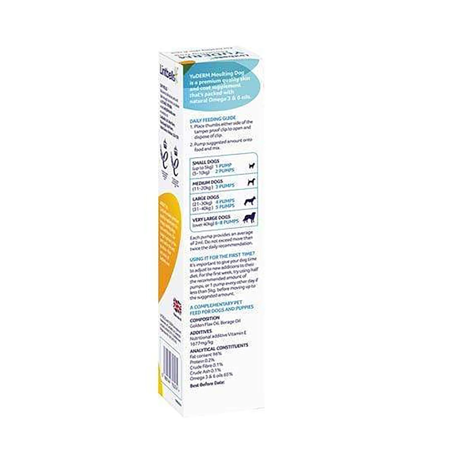 YuDERM Moulting Dog from Lintbells is a premium quality coat and skin supplement that’s full of natural essential Omega 3 and 6 oils. YuDERM Moulting Dog’s premium cold-pressed Golden Flax and Starflower (Borage) oils help reduce moulting and support healthy skin. It can also help boost coat growth and condition to reduce moulting.